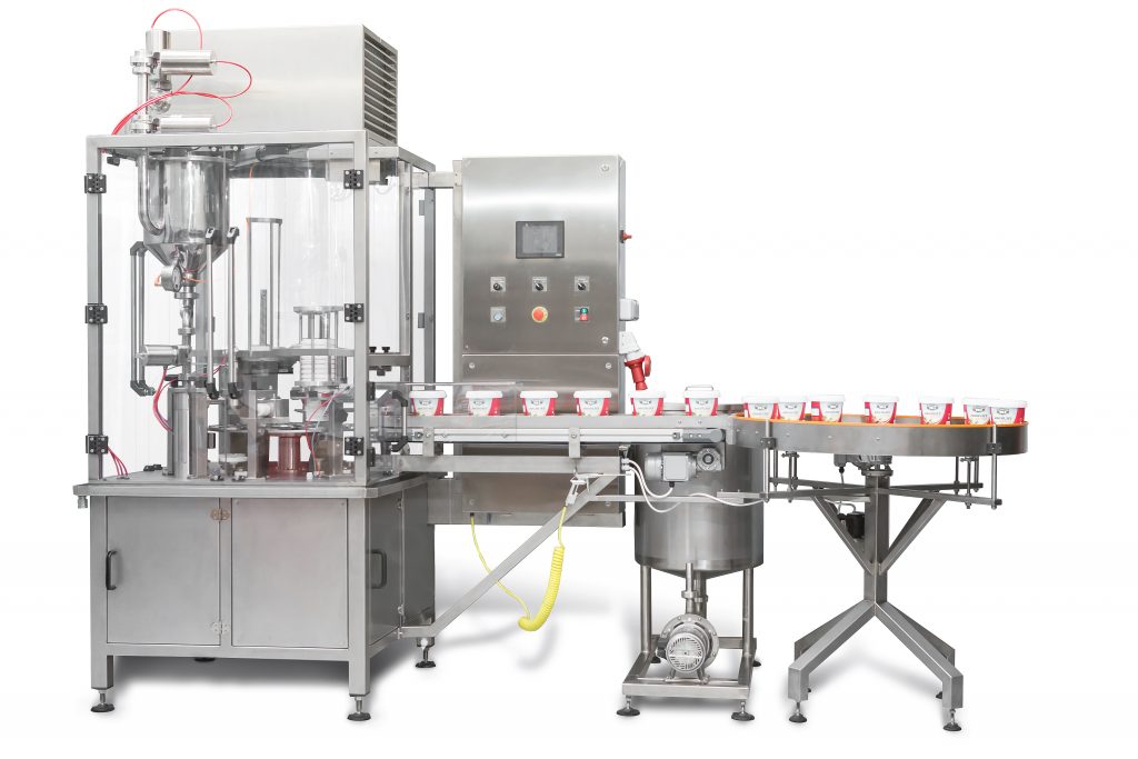 - Az automata pohártöltő gépek egy-, két- vagy háromsoros kivitelben elérhetők cégünknél, teljesítményigénytől függően. A töltőgép automata üzemmódban leszedi a poharat a pohártárból , belehelyezi a fészekbe. A következő lépésben megtölti a termékkel , vagy kiegészítő termékkel a poharat. (A termék pl. hígfolyós tejtermék, joghurt, a kiegészítő termék pl. lekvár.) A berendezés a poharat fedlappal látja el, azt automatikusan ráhelyezi, ráhegeszti, majd szükség szerint műanyag fedelet pattint rá. A töltött készterméket szállítószalagra tolja ki a gép, ami igény esetén a tégelyeket, poharakat dátumozza, feliratozza, gyűjtő körasztalra viszi. Adagnagyság: 100-500 g Teljesítménye: 1-soros automata tégelytöltő gép: 1.800-2.200 pohár / óra2-soros automata tégelytöltő gép: 3.500-4.500 pohár / óra 3-soros automata tégelytöltő gép: 5.000-6.000 pohár / óra 4-soros automata tégelytöltő gép: 6.500-7.500 pohár/óra Választható kiegészítő berendezések: 100l-es tartály steril levegő befújó egység UV csírátlanító egység Lekvár adagoló egység Rápattanós fedél felrakó egység Kihordó- szállítószalag Cseregarnitúra készlet eltérő méretű pohárhoz Vegytintás gumiszámos dátumozó Tintasugaras feliratozó Gyűjtő körasztal a késztermékek részére CIP rendszer Kartontálca hajtogató gép